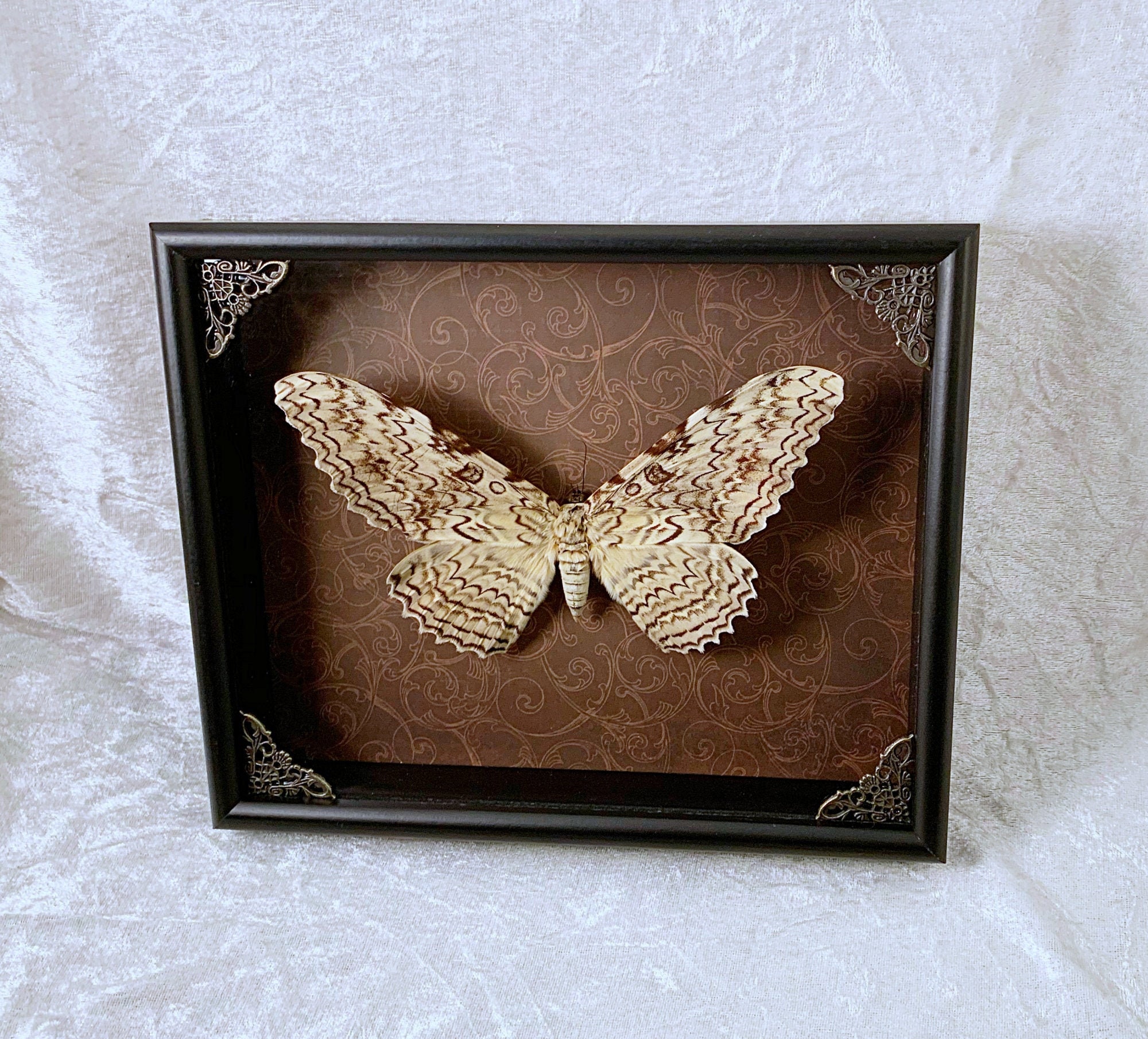 This breathtaking giant moth is mounted into a shadowbox frame that measures roughly 10 in wide by 8 in tall. The background is a dar brown scroll pattern.