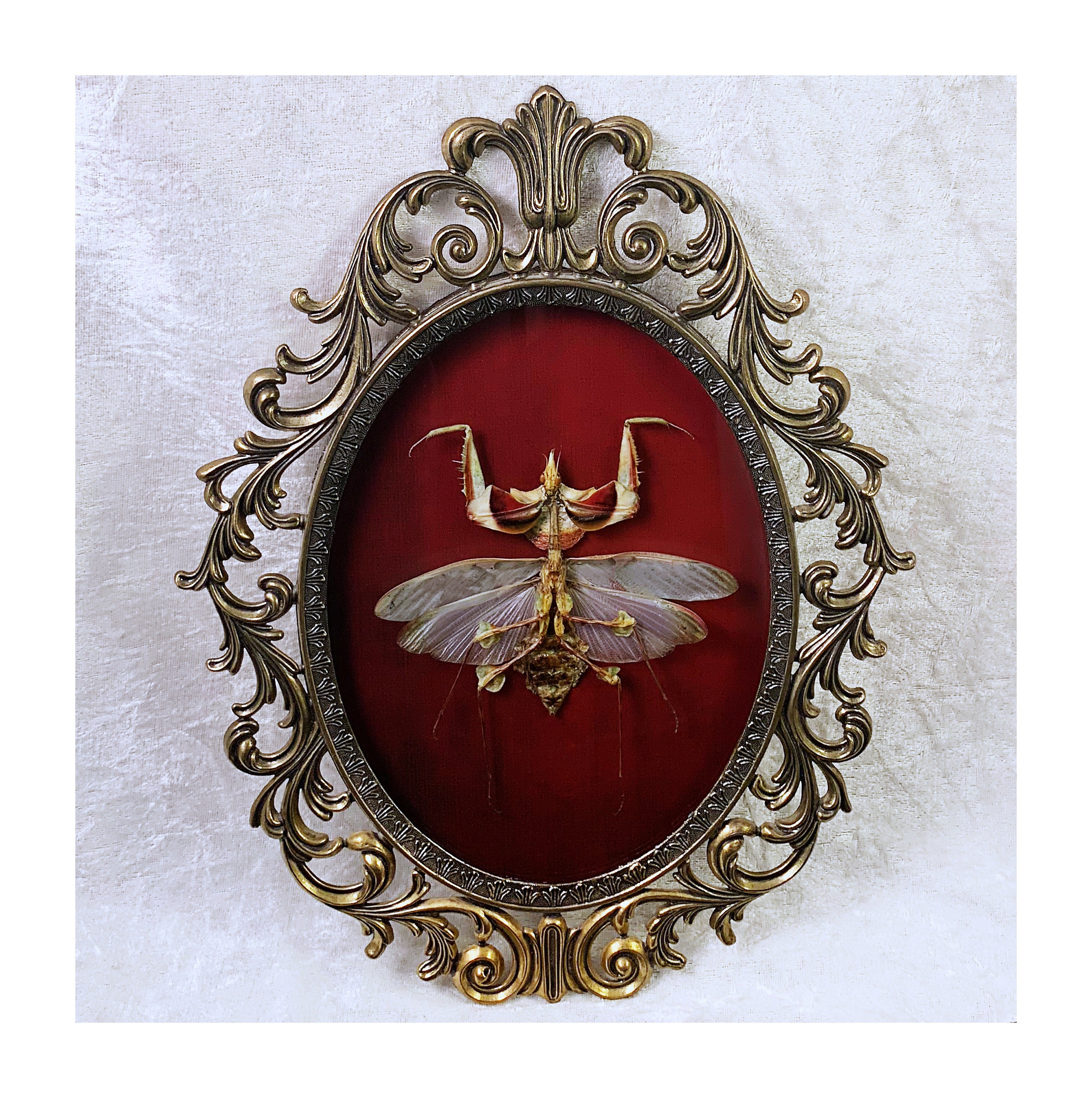 This giant praying mantis is mounted into an antique victorian-style metal frame with convex glass and a distressed red background. The frame measures roughly 13 in tall by 10 in wide.